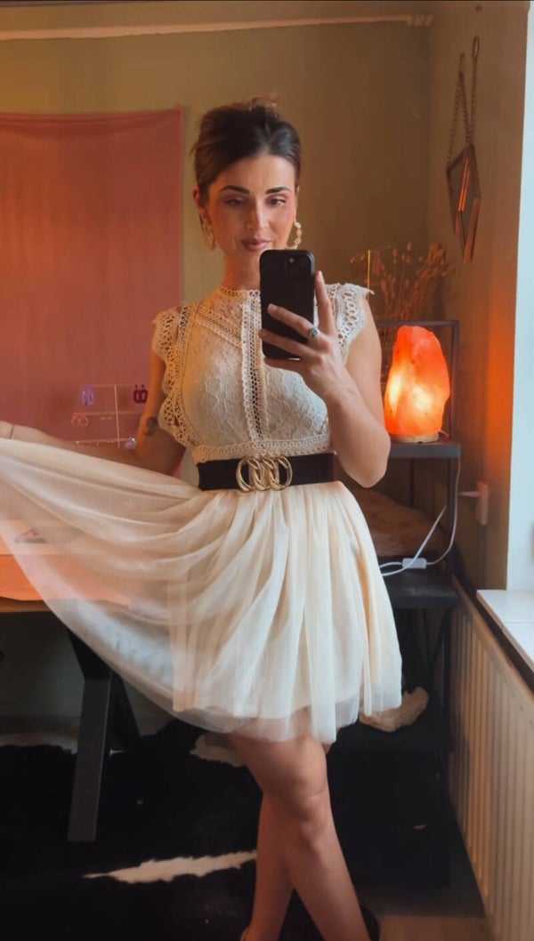 Dit is een super leuk en cute jurkje. De bovenkant van de jurk is beige kant met een kort mouwtje over de schouders met daarop aangesloten een beige tule rok. De achterkant van de jurk is doorzichtig kant voor net dat sexy tintje. Perfecte jurk voor het bruiloftseizoen in combinatie met mooie hakken en oorbellen, maar ook leuk casual met sneakers! Zoals je ziet kan je de jurk ook leuk combineren met een riem in de taille.